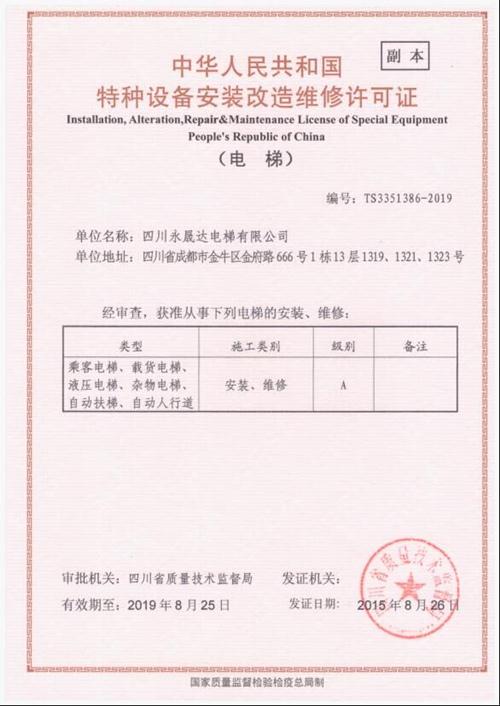 上圖所示,為四川永晟達(dá)電梯有限公司的特種設(shè)備安裝改造A級(jí)資質(zhì)。